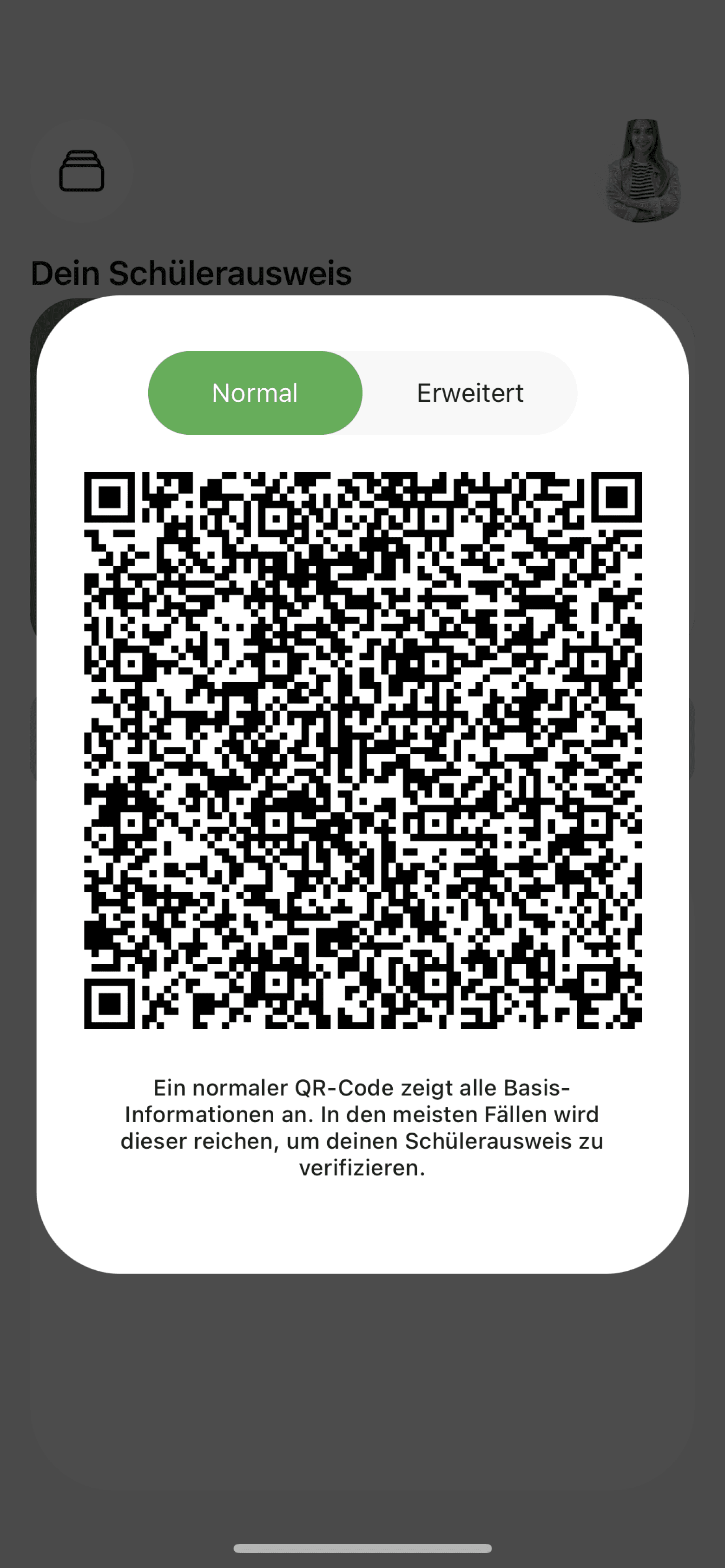 Die Schüler:innen können sich mit einem QR-Code ausweisen, welcher durch unsere App erstellt und verschlüsselt wird. Die andere Partei kann dann die Schülerdaten extern überprüfen, indem Sie den Code scannt.